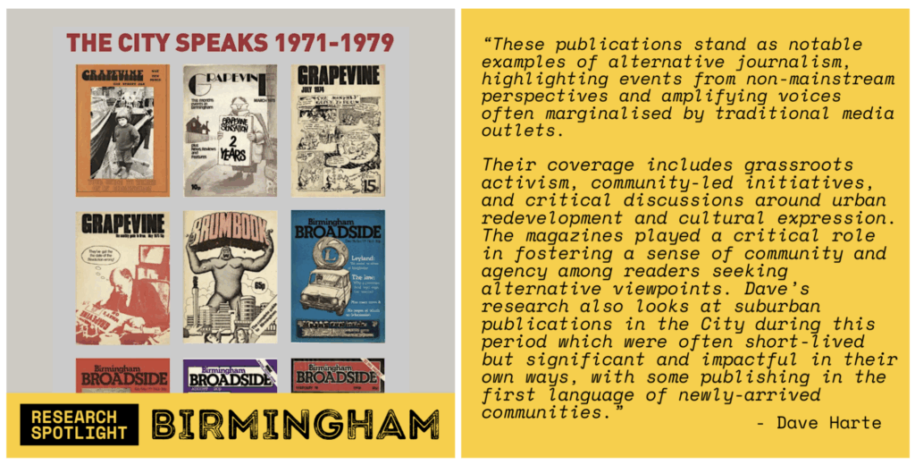 Though Dave Harte didn’t have direct personal experience in working on any of Birmingham’s alternative or community papers in the 1970s, he has a long history of writing about local journalism. Over the last few years he’s been taking a more historical focus in researching these local papers from the 1970s and 80s as well as working with collaborators to make sure the materials are archived. Recently, he’s co-curated an exhibit of these local publications titled ‘The City Speaks 1971-1979’ at the University library. This featured the contribution made by two important listings magazines, Grapevine (1971-75) and Broadside (1976-79), which documented the city’s social, economic, and cultural life during a transformative period marked by significant political and societal shifts. You can read more about the exhibit here: https://bcmcr.org/research/the-city-speaks-1971-1979/