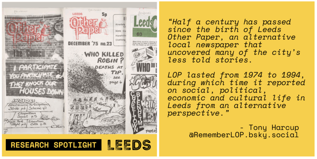 Tony Harcup began working in the alternative local press in the 1970s and that experience has informed his journalism, his teaching and his research ever since. Tony has written extensively about Leeds Other Paper, which ran in West Yorkshire for a remarkable 20 years between 1974 and 1994 – and his 2012 book “Alternative Journalism, Alternative Voices” places that newspaper in the context of other local, national and international examples of independent media production. Over the last couple of years, Tony has given a number of talks on the history, significance and legacy of Leeds Other Paper as well as running the Remember LOP account on the social media platform Bluesky https://bsky.app/profile/rememberlop.bsky.social.
